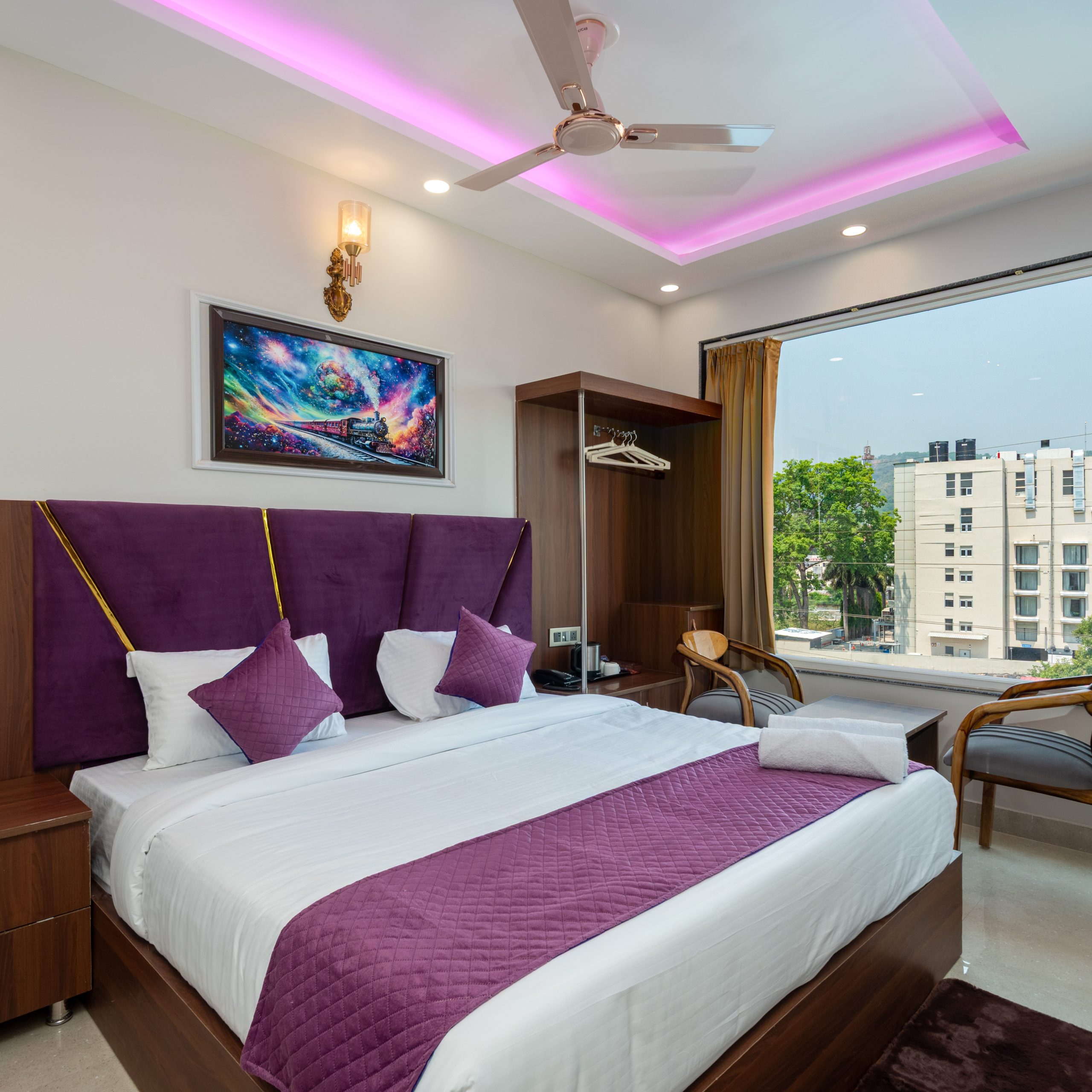 Hotel Purple Dot features well-appointed rooms, including Deluxe and Premium categories, each offering city views. Rooms are equipped with amenities such as air conditioning, flat-screen TVs, and complimentary bottled water. including breakfast and all-inclusive packages.